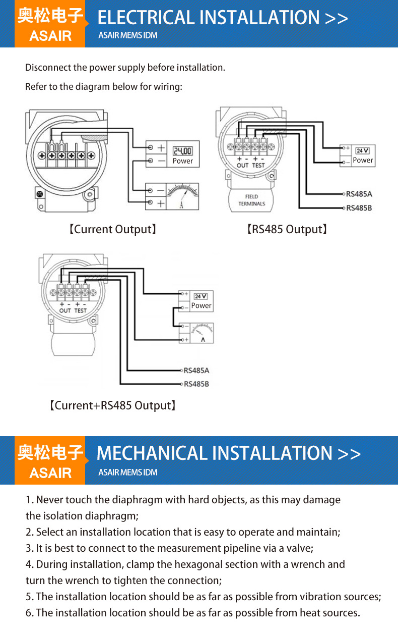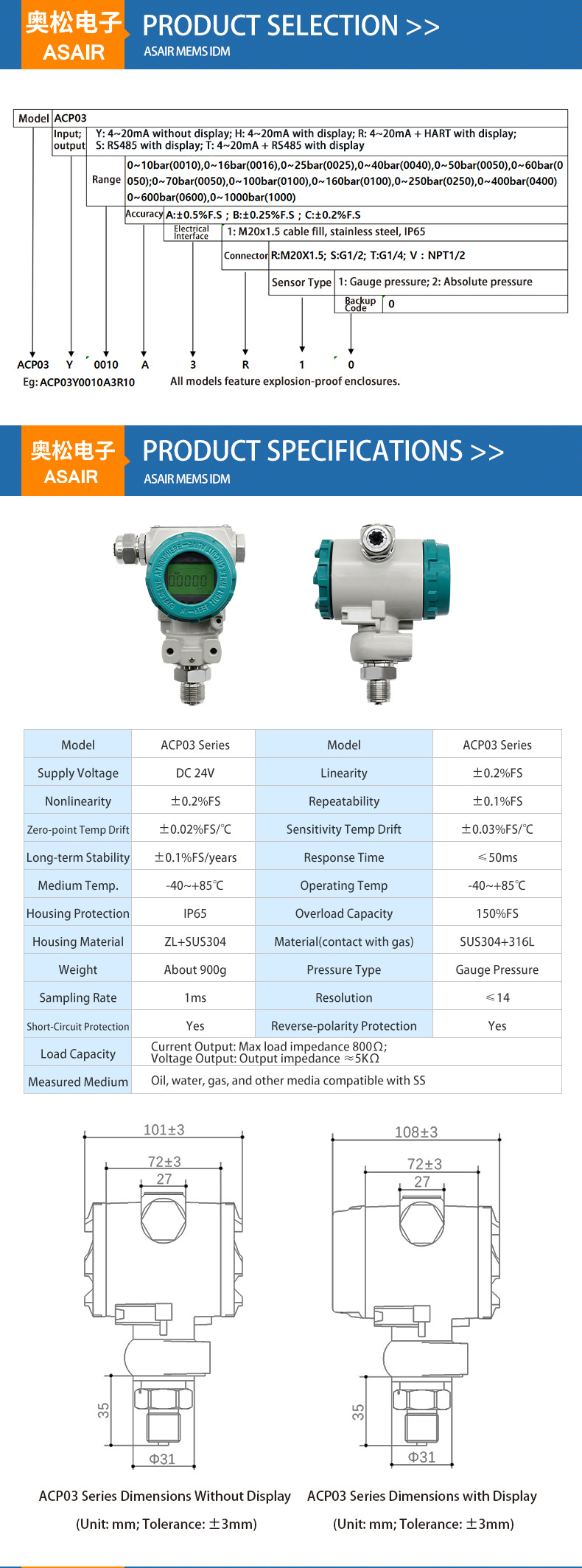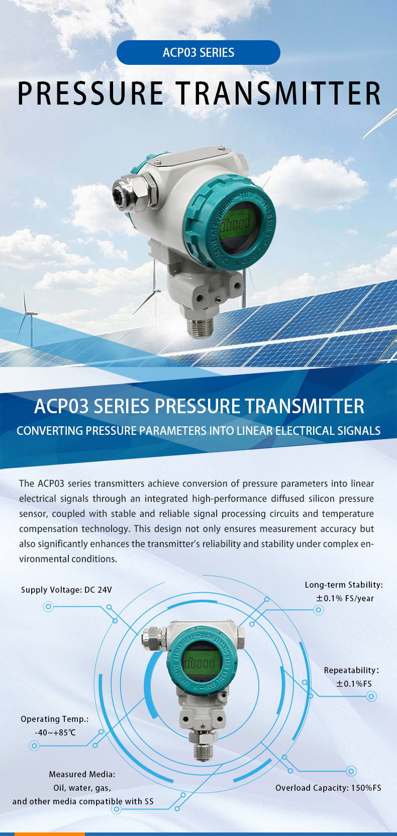 The ACP03 series transmitters achieve conversion of pressure parameters into linear electrical signals through an integrated high-performance diffused silicon pressure sensor, coupled with stable and reliable signal processing circuits and temperature compensation technology. This design not only ensures measurement accuracy but also significantly enhances the transmitter’s reliability and stability under complex environmental conditions.