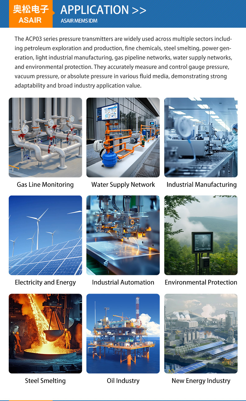 The ACP03 series pressure transmitters are widely used across multiple sectors including petroleum exploration and production, fine chemicals, steel smelting, power generation, light industrial manufacturing, gas pipeline networks, water supply networks, and environmental protection. They accurately measure and control gauge pressure, vacuum pressure, or absolute pressure in various fluid media, demonstrating strong adaptability and broad industry application value.