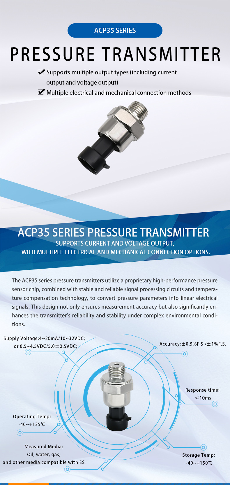 The ACP35 series pressure transmitters utilize a proprietary high-performance pressure sensor chip, combined with stable and reliable signal processing circuits and temperature compensation technology, to convert pressure parameters into linear electrical signals. This design not only ensures measurement accuracy but also significantly enhances the transmitter’s reliability and stability under complex environmental conditions.
