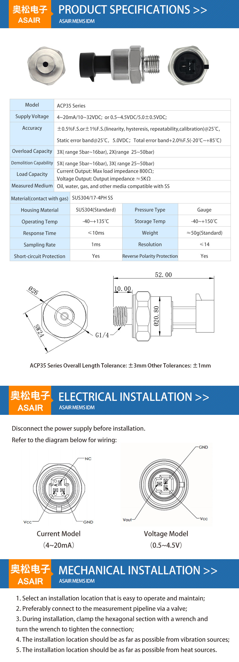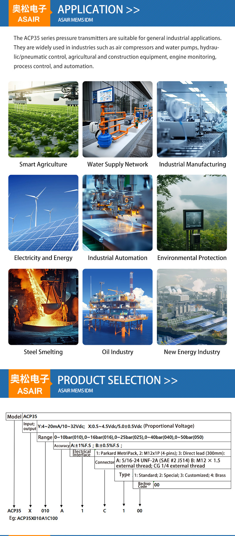 The ACP35 series pressure transmitters are suitable for general industrial applications. They are widely used in industries such as air compressors and water pumps, hydraulic/pneumatic control, agricultural and construction equipment, engine monitoring, process control, and automation.