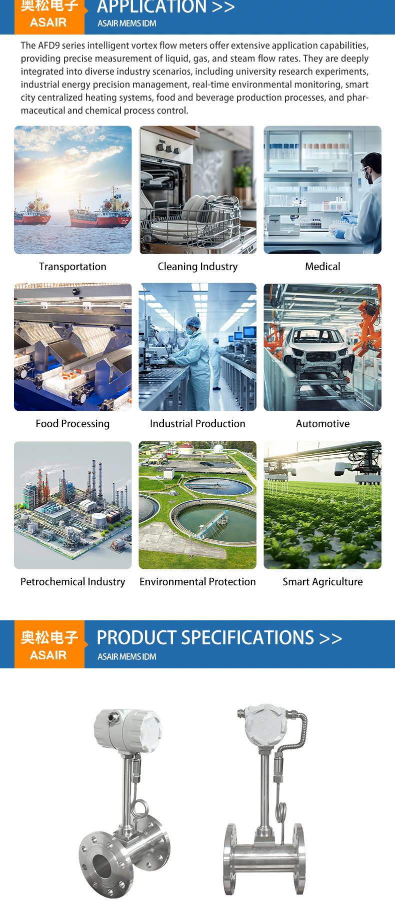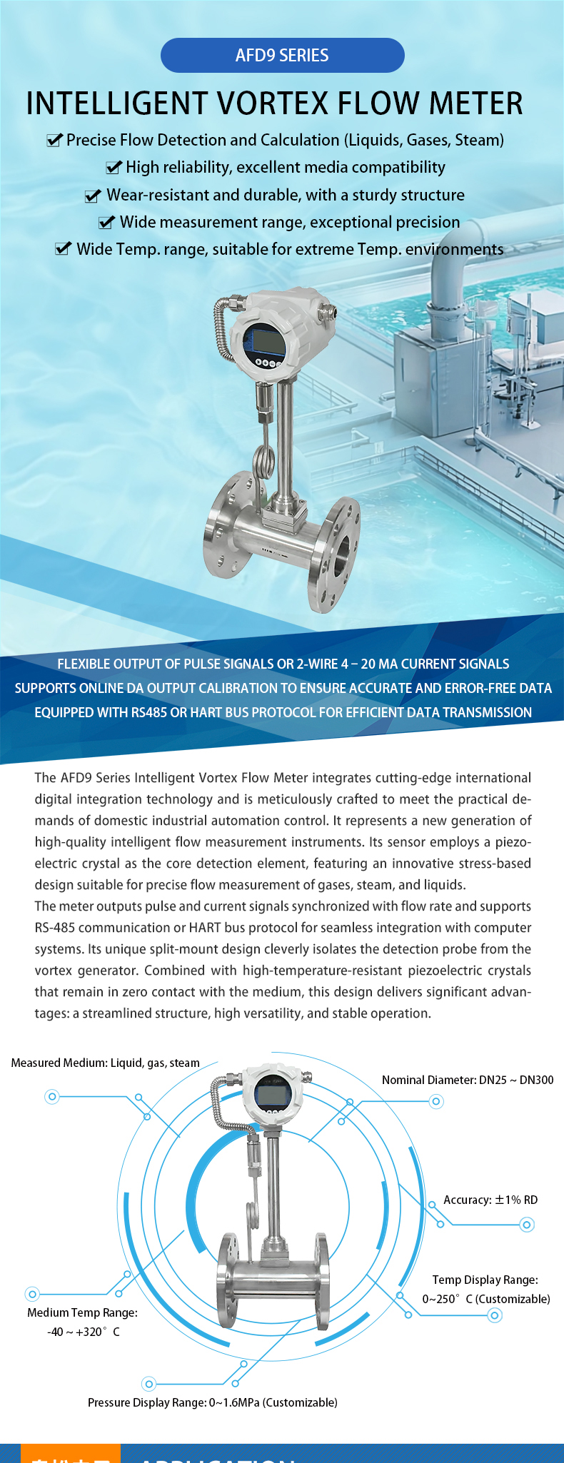 The AFD9 series intelligent vortex flow meters offer extensive application capabilities, providing precise measurement of liquid, gas, and steam flow rates. They are deeply integrated into diverse industry scenarios, including university research experiments, industrial energy precision management, real-time environmental monitoring, smart city centralized heating systems, food and beverage production processes, and pharmaceutical and chemical process control.