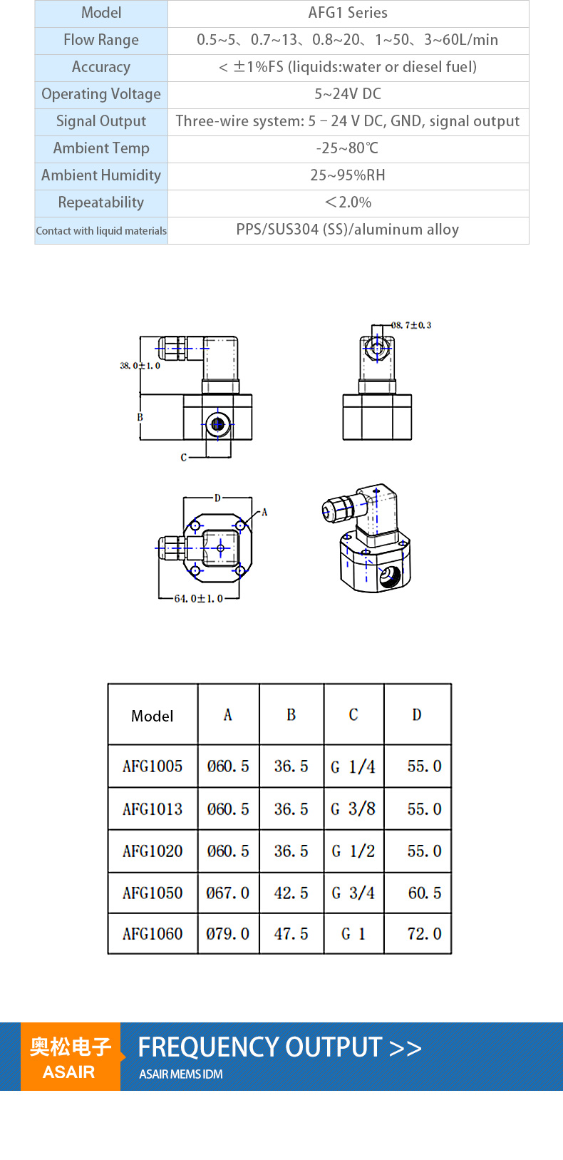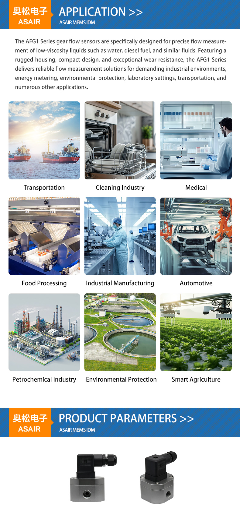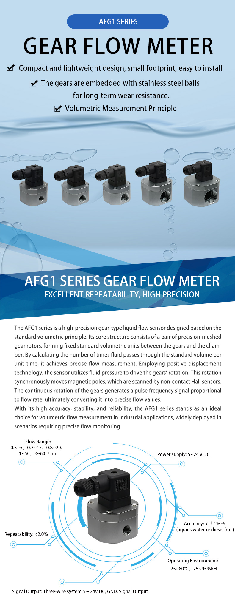 The AFG1 series is a high-precision gear-type liquid flow sensor designed based on the standard volumetric principle. Its core structure consists of a pair of precision-meshed gear rotors, forming fixed standard volumetric units between the gears and the chamber. By calculating the number of times fluid passes through the standard volume per unit time, it achieves precise flow measurement. Employing positive displacement technology, the sensor utilizes fluid pressure to drive the gears’ rotation. This rotation synchronously moves magnetic poles, which are scanned by non-contact Hall sensors. The continuous rotation of the gears generates a pulse frequency signal proportional to flow rate, ultimately converting it into precise flow values. With its high accuracy, stability, and reliability, the AFG1 series stands as an ideal choice for volumetric flow measurement in industrial applications, widely deployed in scenarios requiring precise flow monitoring.