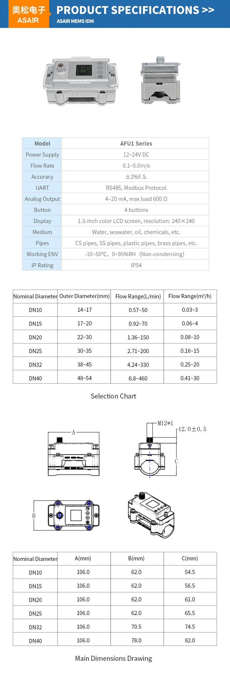 The AFU1 ultrasonic liquid flow sensor boasts a wide range of applications as a commonly used measurement instrument. Featuring a robust housing, compact design, non-invasive installation, and low maintenance costs, it delivers versatile sensing solutions for demanding industrial production environments, energy metering, environmental protection, laboratory settings, transportation, and other scenarios.