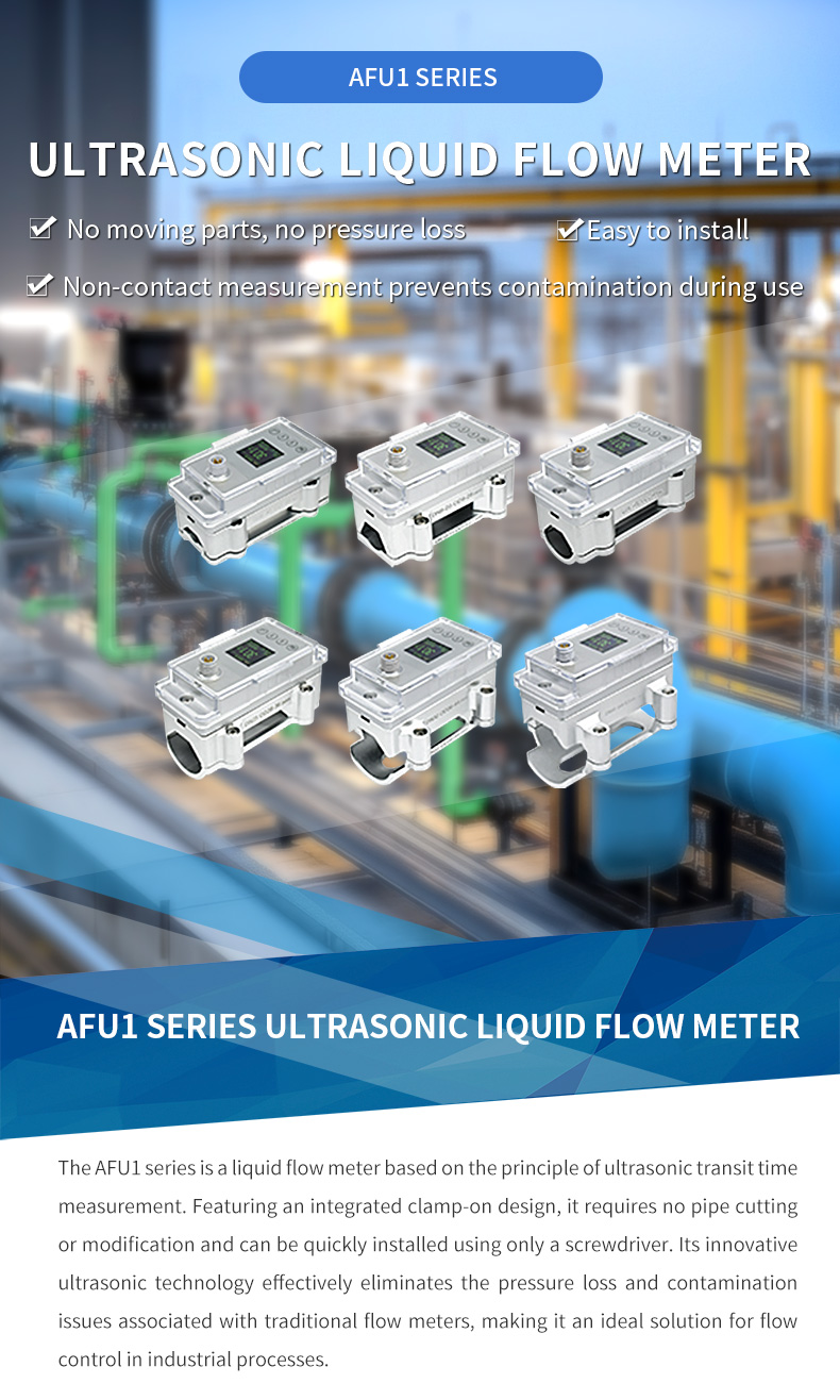 The AFU1 series is a liquid flow meter based on the principle of ultrasonic transit time measurement. Featuring an integrated clamp-on design, it requires no pipe cutting or modification and can be quickly installed using only a screwdriver. Its innovative ultrasonic technology effectively eliminates the pressure loss and contamination issues associated with traditional flow meters, making it an ideal solution for flow control in industrial processes.