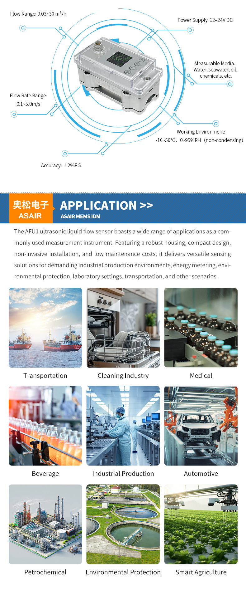 The AFU1 ultrasonic liquid flow sensor boasts a wide range of applications as a commonly used measurement instrument. Featuring a robust housing, compact design, non-invasive installation, and low maintenance costs, it delivers versatile sensing solutions for demanding industrial production environments, energy metering, environmental protection, laboratory settings, transportation, and other scenarios.