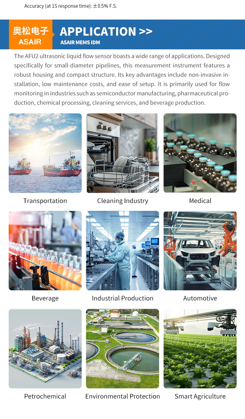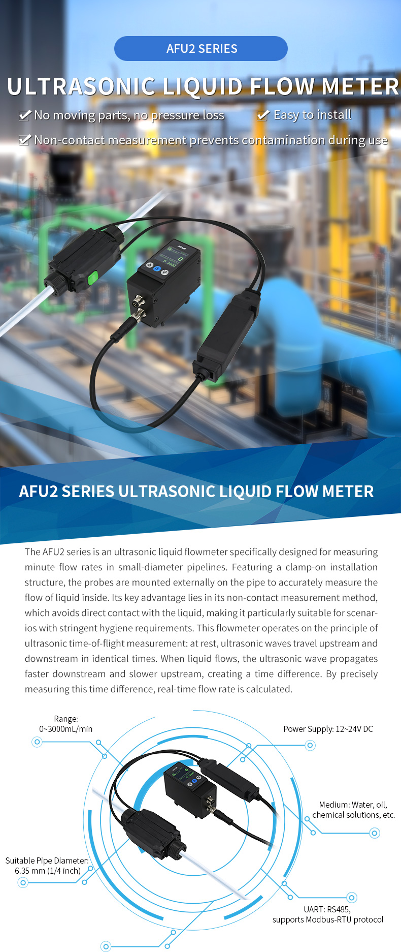 The AFU2 ultrasonic liquid flow sensor boasts a wide range of applications. Designed specifically for small-diameter pipelines, this measurement instrument features a robust housing and compact structure. Its key advantages include non-invasive installation, low maintenance costs, and ease of setup. It is primarily used for flow monitoring in industries such as semiconductor manufacturing, pharmaceutical production, chemical processing, cleaning services, and beverage production.