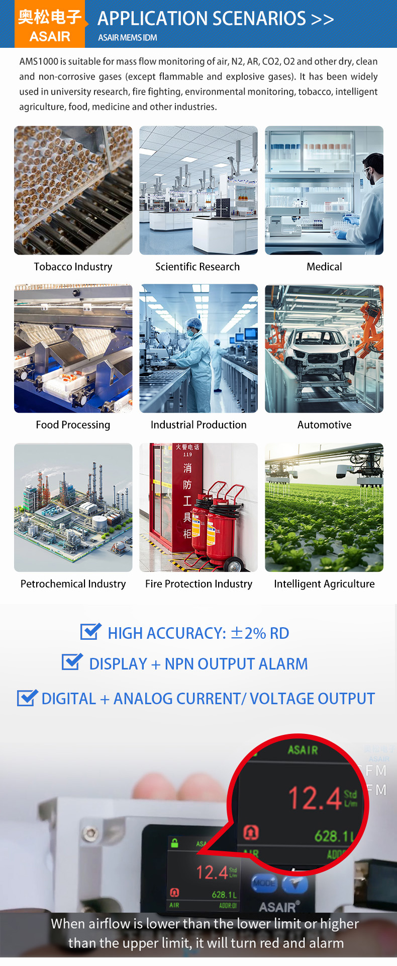 AMS1000 can be used to monitor the mass flow of air, nitrogen, argon, carbon dioxide, helium, oxygen and other dry, clean and non-corrosive gases (except for flammable and explosive gases). It can be widely used in fields, such as university scientific research, fire protection, environmental monitoring, and industries of tobacco, smart agriculture, food and medicine.