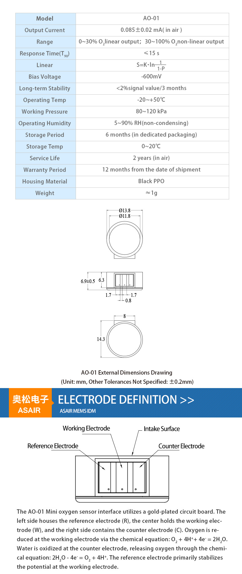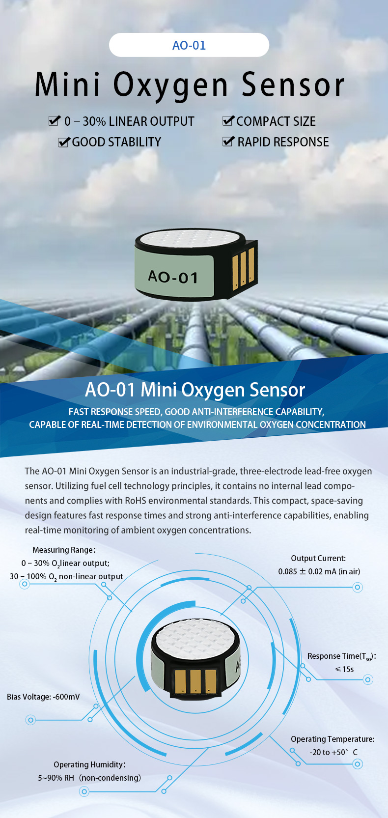 The AO-01 Mini Oxygen Sensor is an industrial-grade, three-electrode lead-free oxygen sensor. Utilizing fuel cell technology principles, it contains no internal lead components and complies with RoHS environmental standards. This compact, space-saving design features fast response times and strong anti-interference capabilities, enabling real-time monitoring of ambient oxygen concentrations.