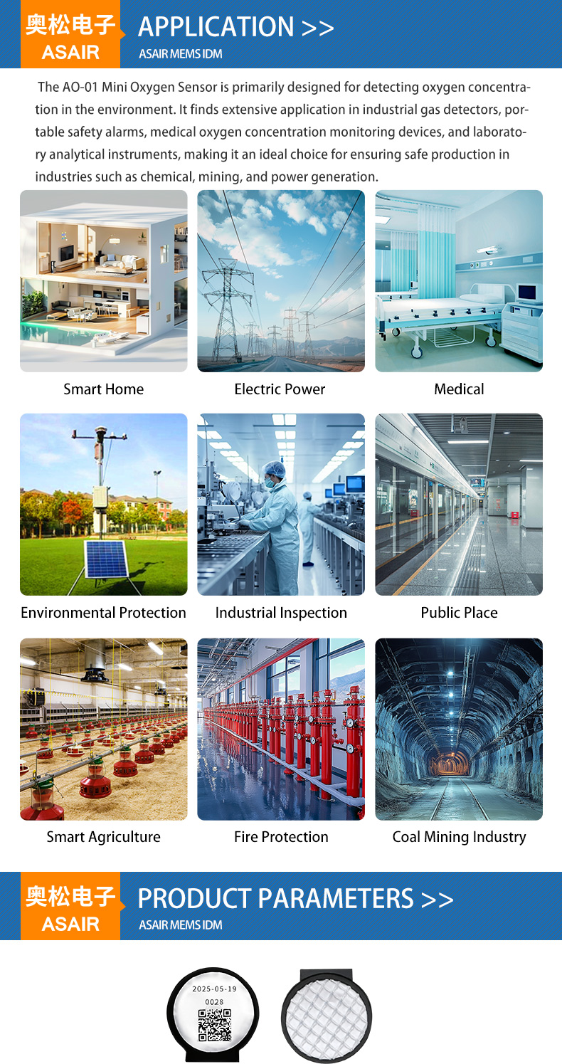 The AO-01 Mini Oxygen Sensor is primarily designed for detecting oxygen concentration in the environment. It finds extensive application in industrial gas detectors, portable safety alarms, medical oxygen concentration monitoring devices, and laboratory analytical instruments, making it an ideal choice for ensuring safe production in industries such as chemical, mining, and power generation.