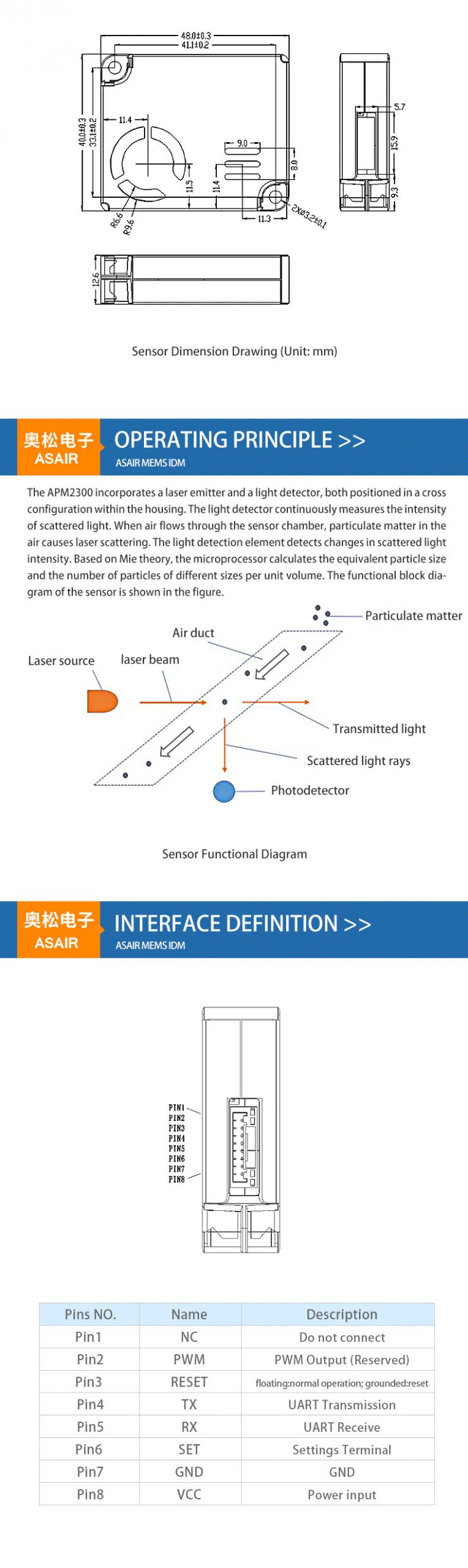 The APM2300 is a meticulously designed digital particulate matter sensor based on laser scattering principles. It provides real-time detection of particulate matter concentrations within the 0.3 to 10μm size range, offering multiple digital output interfaces. Featuring automatic self-calibration upon startup, it ensures high measurement stability and accuracy. Furthermore, its compact design facilitates seamless integration into various applications.