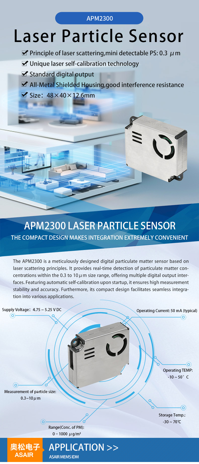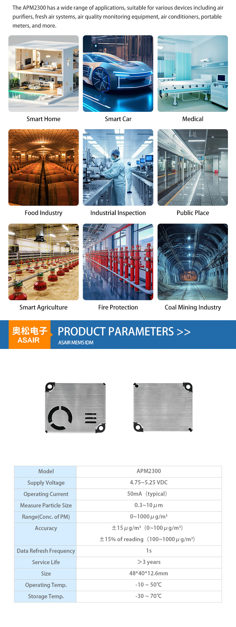 The APM2300 has a wide range of applications, suitable for various devices including air purifiers, fresh air systems, air quality monitoring equipment, air conditioners, portable meters, and more.