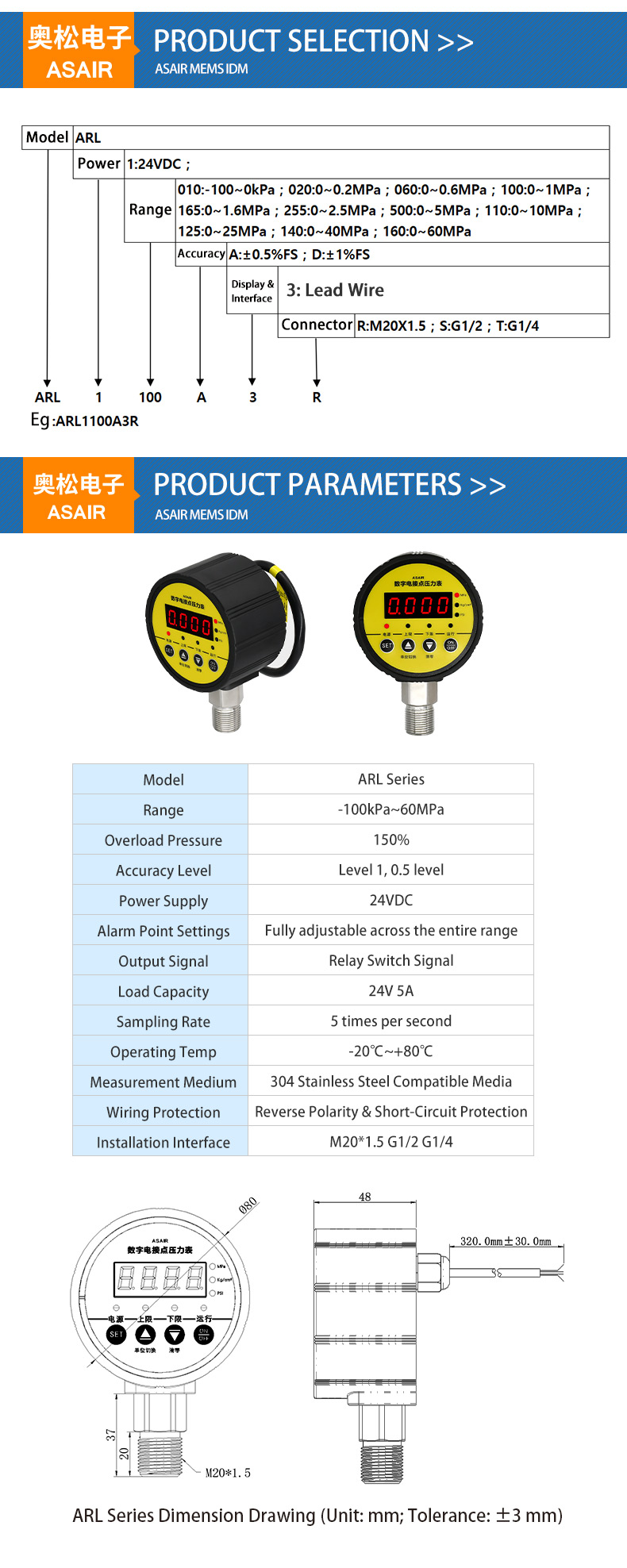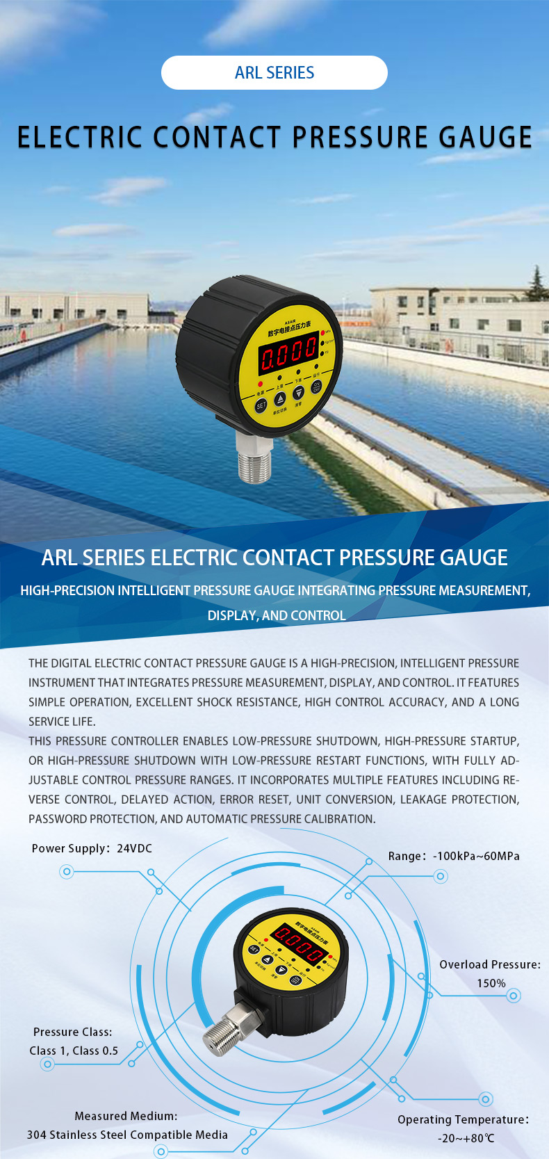 The digital electric contact pressure gauge is a high-precision, intelligent pressure instrument that integrates pressure measurement, display, and control. It features simple operation, excellent shock resistance, high control accuracy, and a long service life. This pressure controller enables low-pressure shutdown, high-pressure startup, or high-pressure shutdown with low-pressure restart functions, with fully adjustable control pressure ranges. It incorporates multiple features including reverse control, delayed action, error reset, unit conversion, leakage protection, password protection, and automatic pressure calibration.