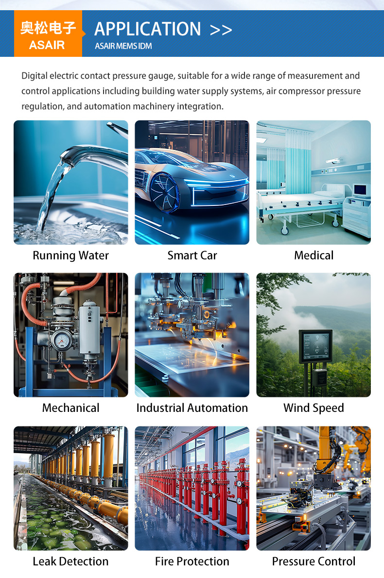 Digital electric contact pressure gauge, suitable for a wide range of measurement and control applications including building water supply systems, air compressor pressure regulation, and automation machinery integration.